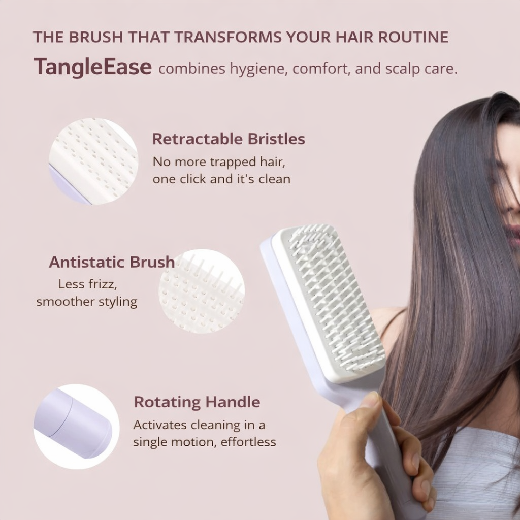 Experience effortless detangling and mess-free grooming with our self-cleaning brush. One simple motion removes all hair, saving you time while keeping your brush ready for every use — comfortable, efficient, and suitable for all hair types.